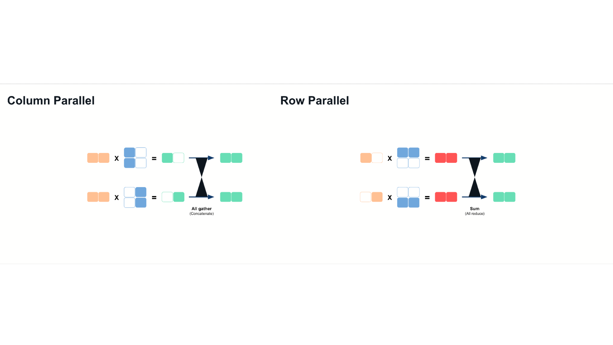- Row Parallelism: Splitting matrices along rows, summing partial results post-computation.